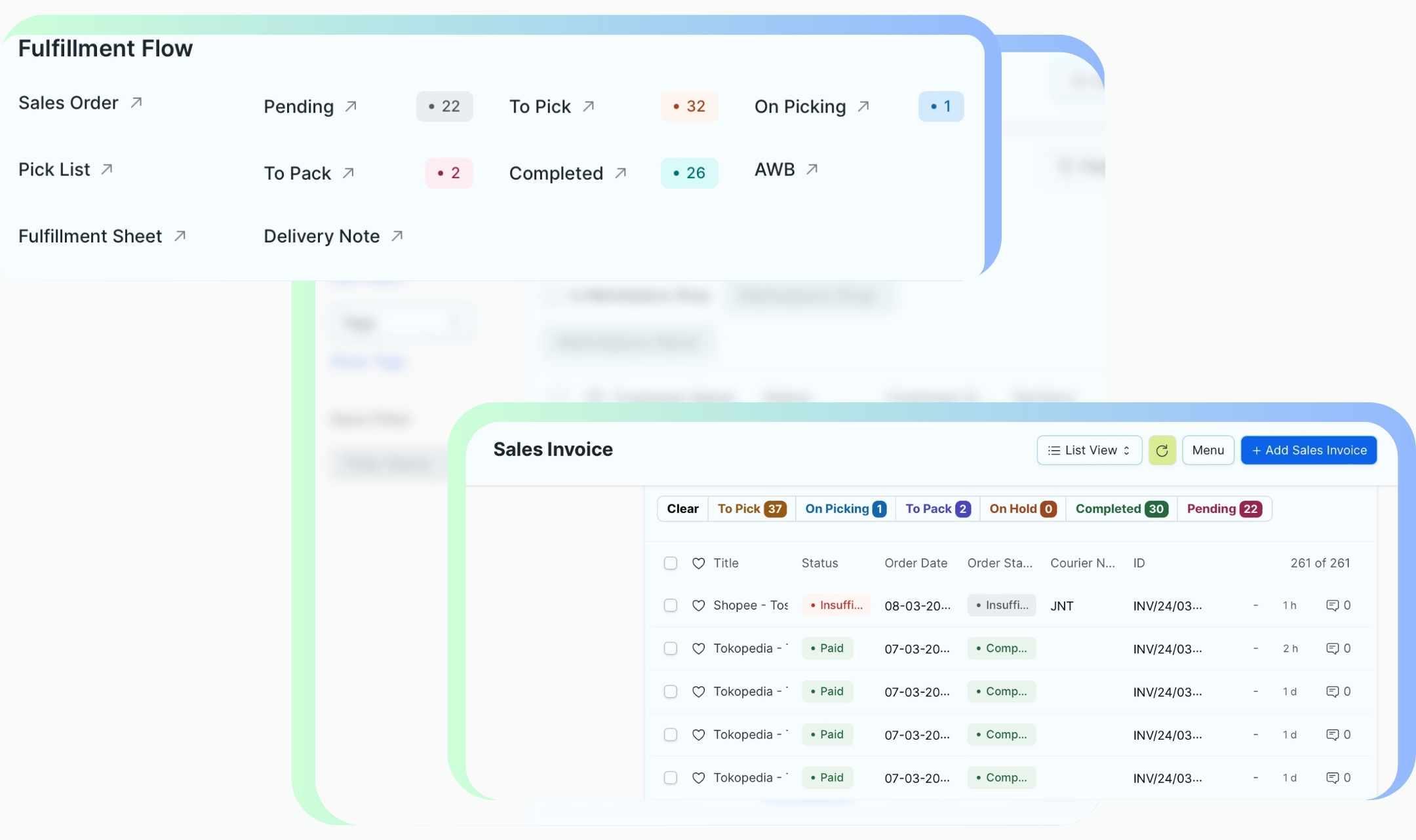 Lacak paket di setiap tahapan fulfillment mulai dari order masuk - Pending - To Pick - To Pack - Completed - Delivered.