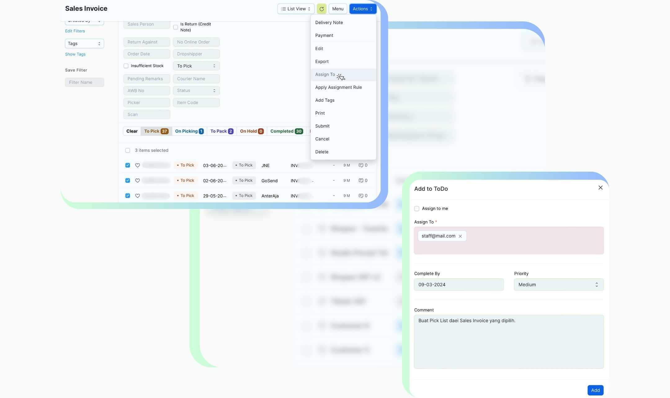 Alokasikan order atau Pick List ke Picker secara batch dan lacak setiap tahapan.