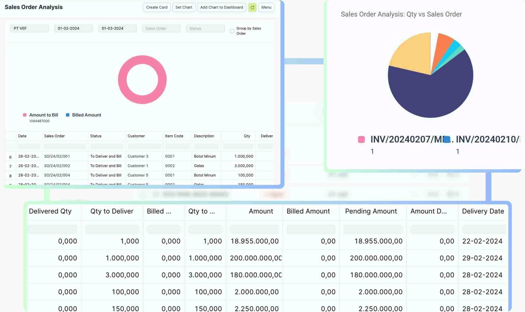 Fitur Sales Order Analysis di VEF memberikan kemampuan untuk memantau dan menganalisis pesanan penjualan secara mendetail. Fitur ini menyajikan berbagai informasi penting yang membantu dalam pengambilan keputusan dan peningkatan efisiensi penjualan seperti, sales order, customer, qty to deliver, delivered qty, dan lain-lain