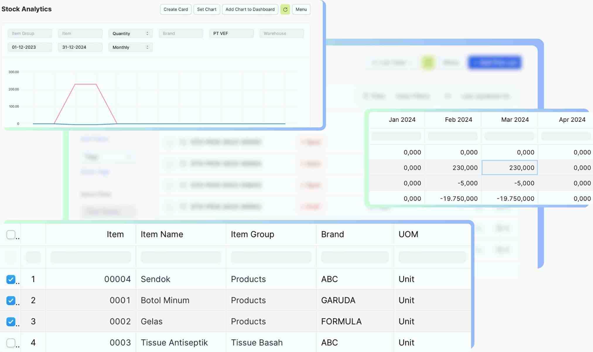 Dengan fitur Stock Analytics, anda dapat menganalisa jumlah stok per tahun, bulan, bahkan per minggu serta dapat divisualisasikan ke dalam bentuk diagram yang mudah dipahami.