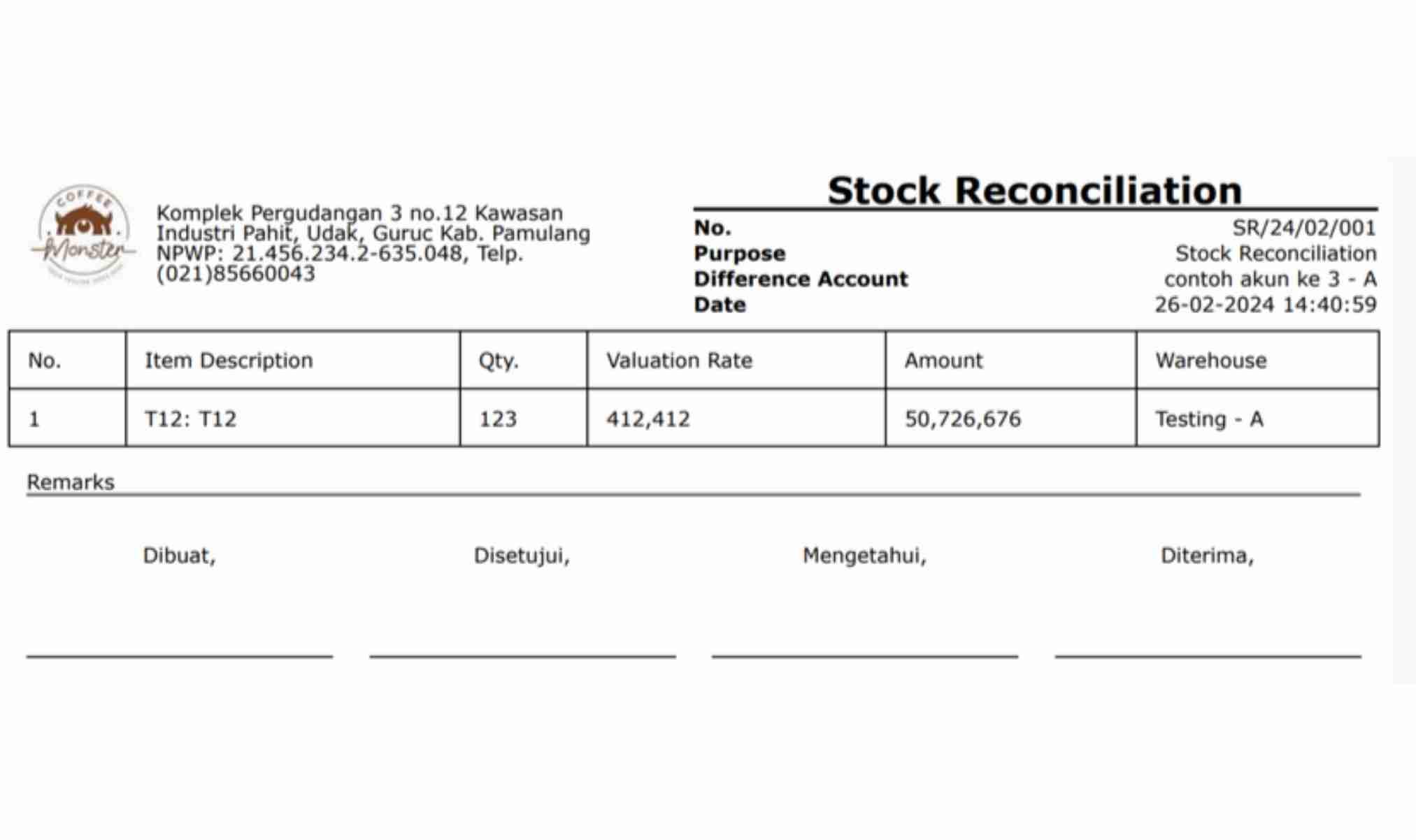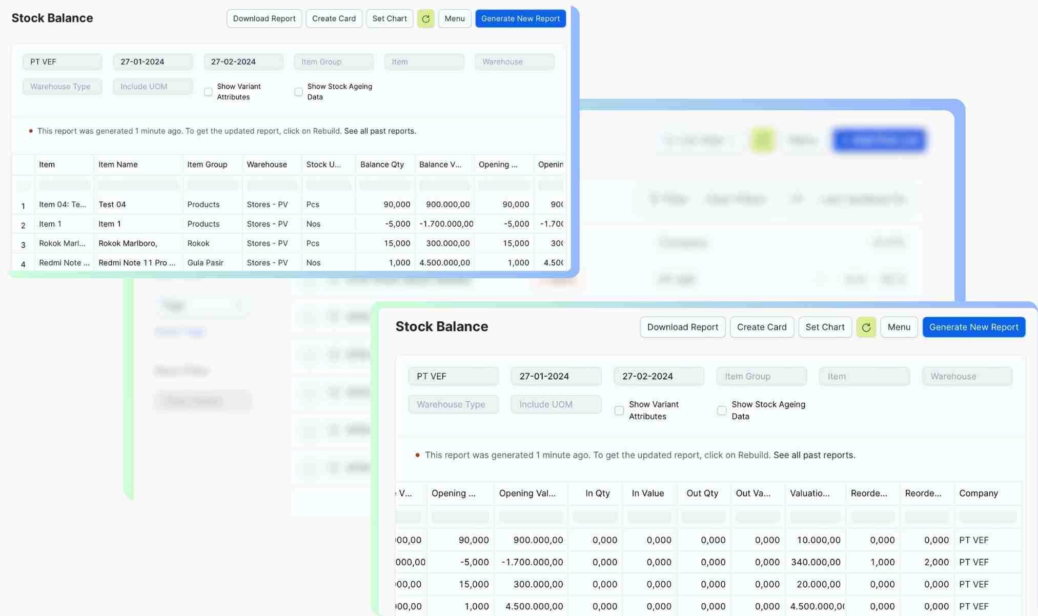 Lihat saldo stok per item disertai ringkasan keluar-masuk sesuai periode. Bisa filter per SKU, gudang, merek, kategori sesuai kebutuhan