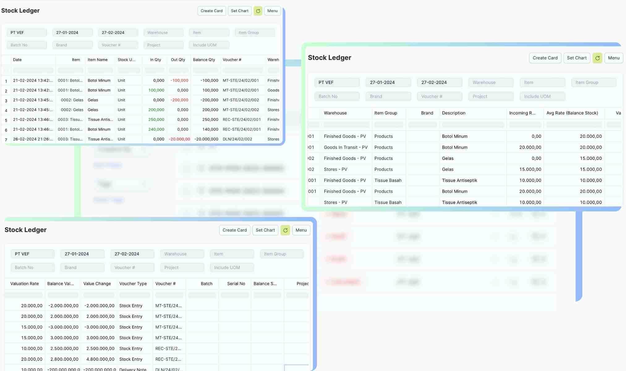 Lacak mutasi stok keluar-masuk secara rinci dan terhubung dengan voucher transaksi pembentuk